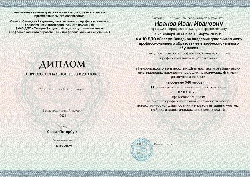 Курс обучения Нейропсихология взрослых. Диагностика и реабилитация лиц, имеющих нарушения высших психических функций различного генеза (340ч)